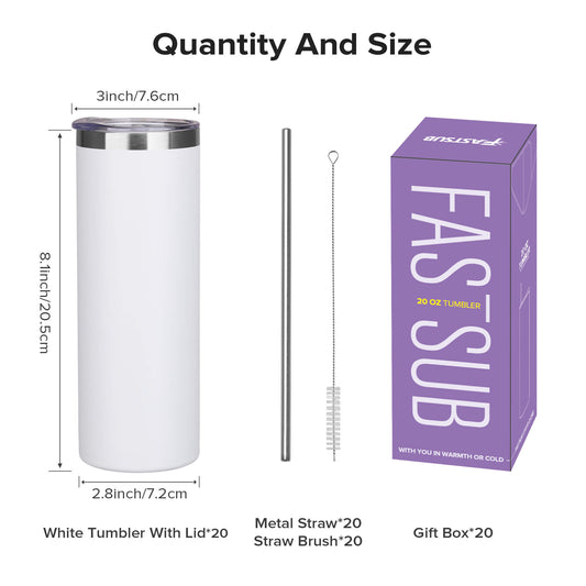 20 oz Powder Coated Skinny Tumbler - White | 20 Pack
