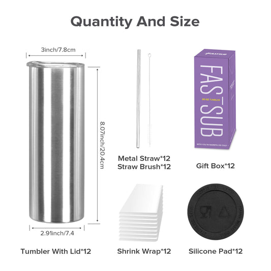 • 20 oz Stainless Steel Silver Sublimation Tumblers  | 12 Pack - FASTSUB
